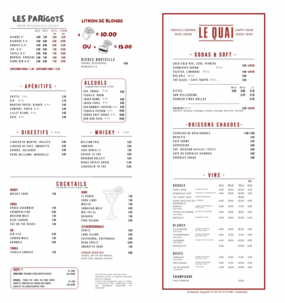 Le Quai vous accueille du lundi au vendredi de 8h à 2h du matin et samedi et dimanche de 10h à 2h du matin, (service continu de 11h30 à 23h30 tous les jours).