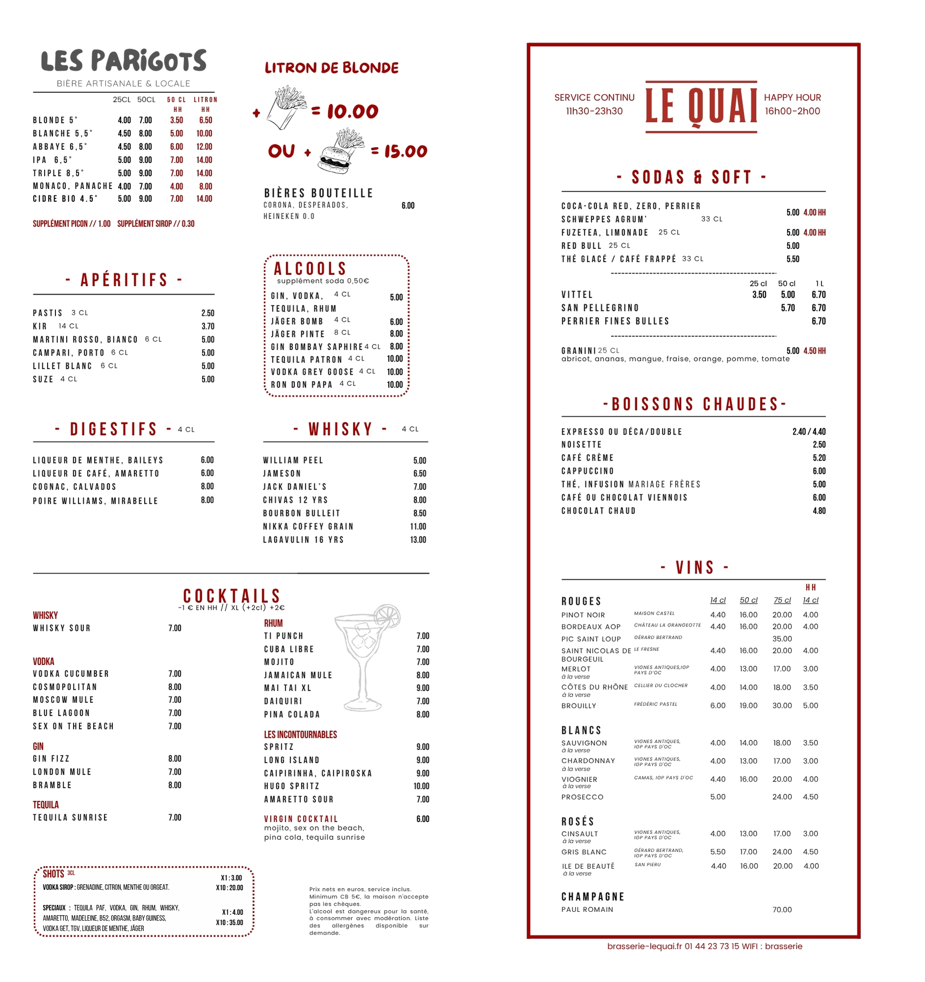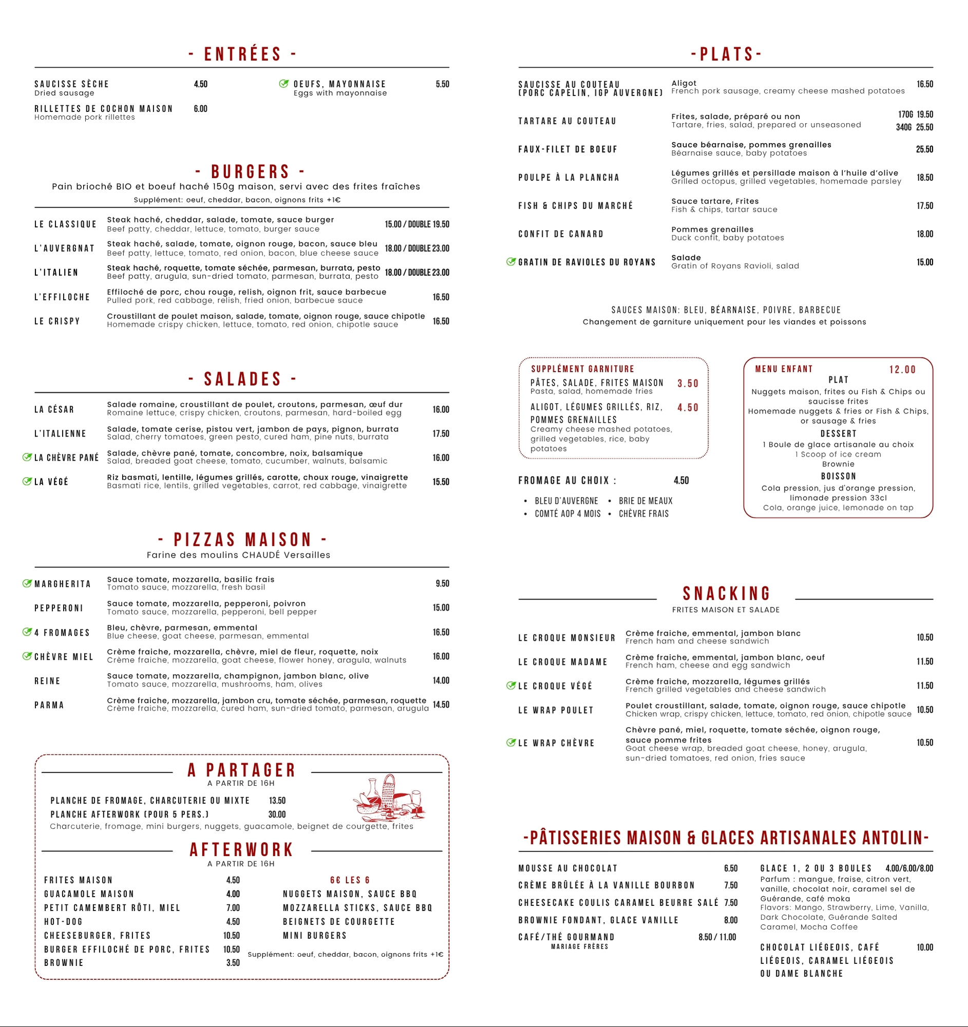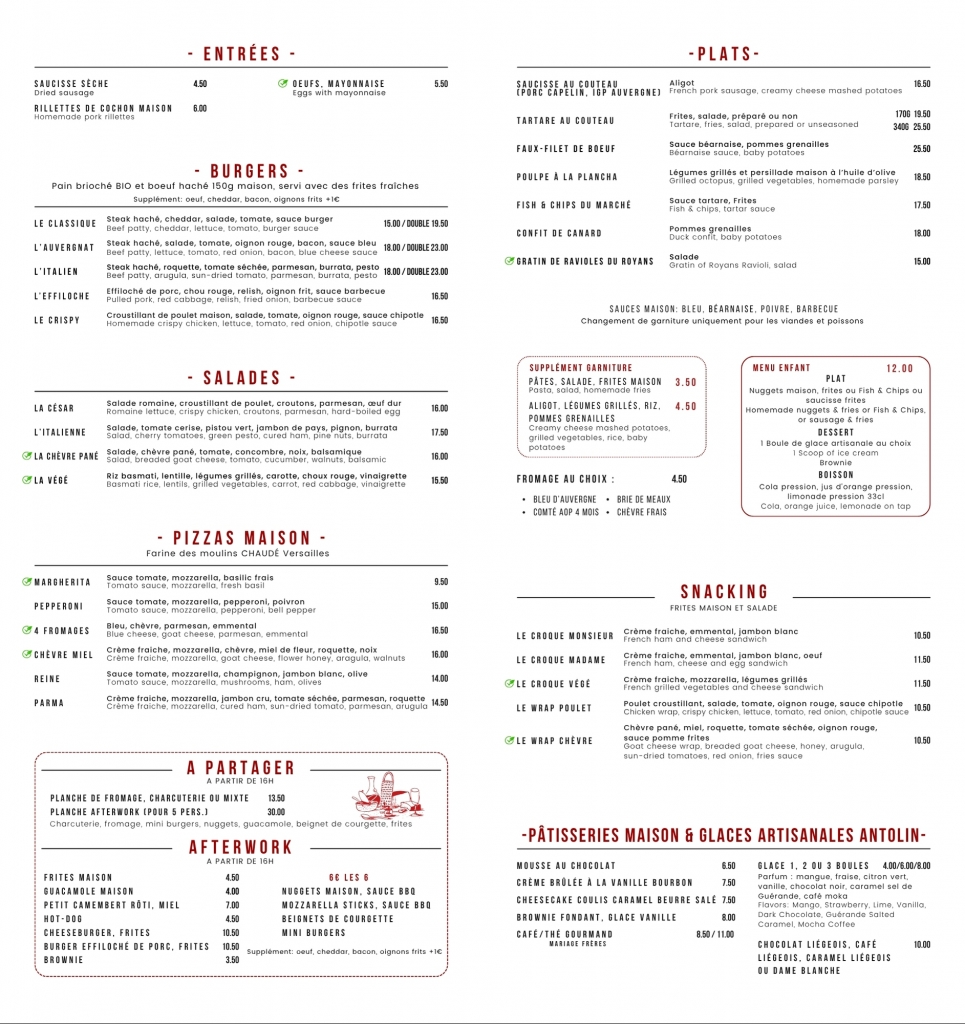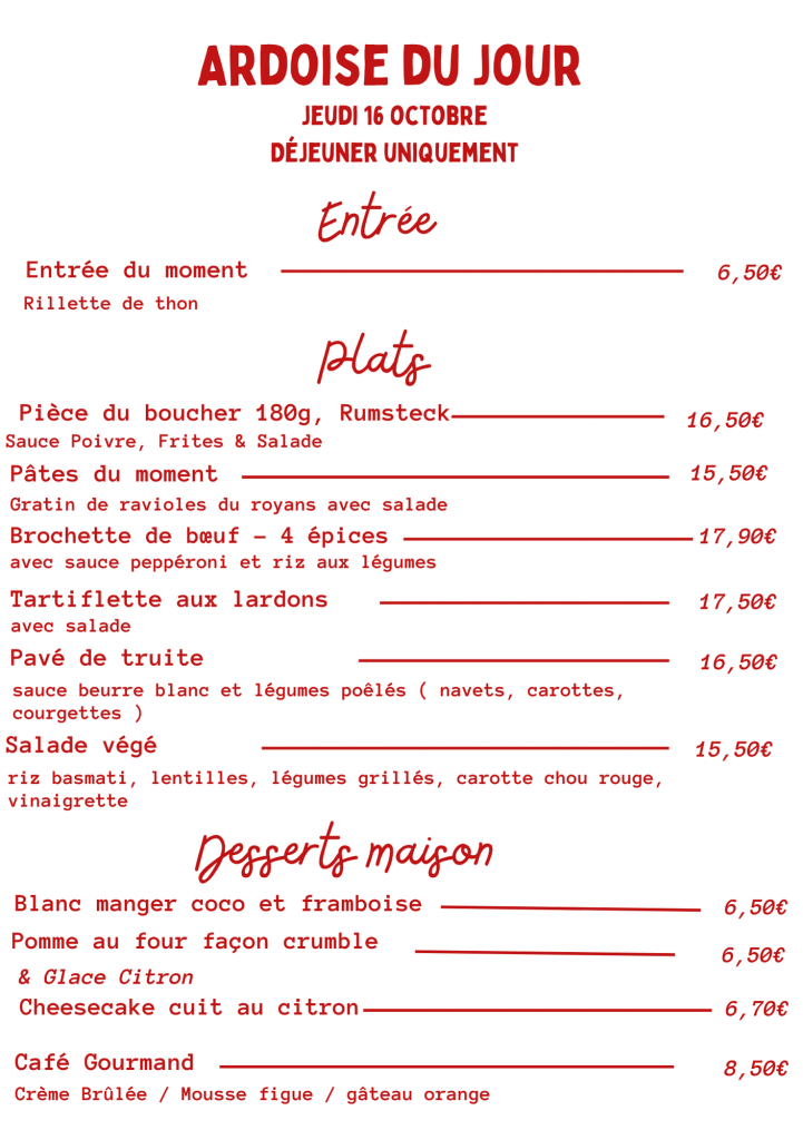 L’after work : tous les jours de 16h à 2h la pinte (50cl) de bière blonde est à 3.5€ et l’assiette de frites maison et sa mayonnaise maison : 4.5€.